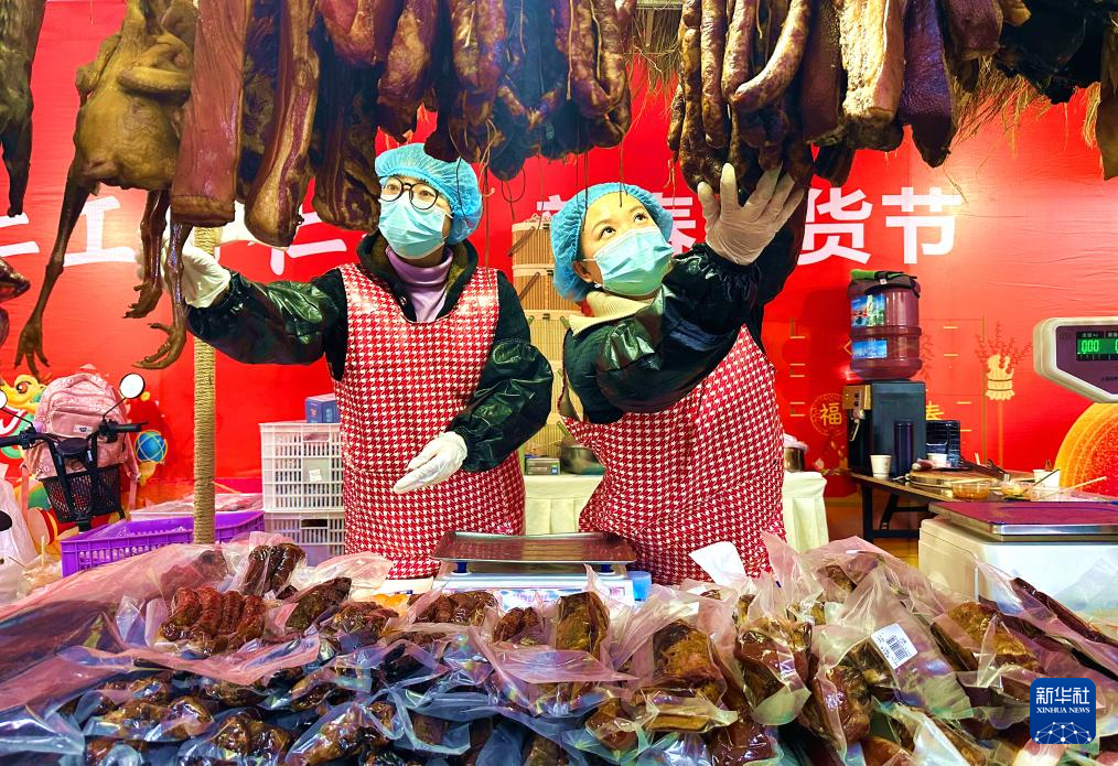 1月18日,在四川省眉山市仁壽縣新春年貨節(jié)展銷會上,商家在整理年貨。新華社發(fā)(潘建勇攝)