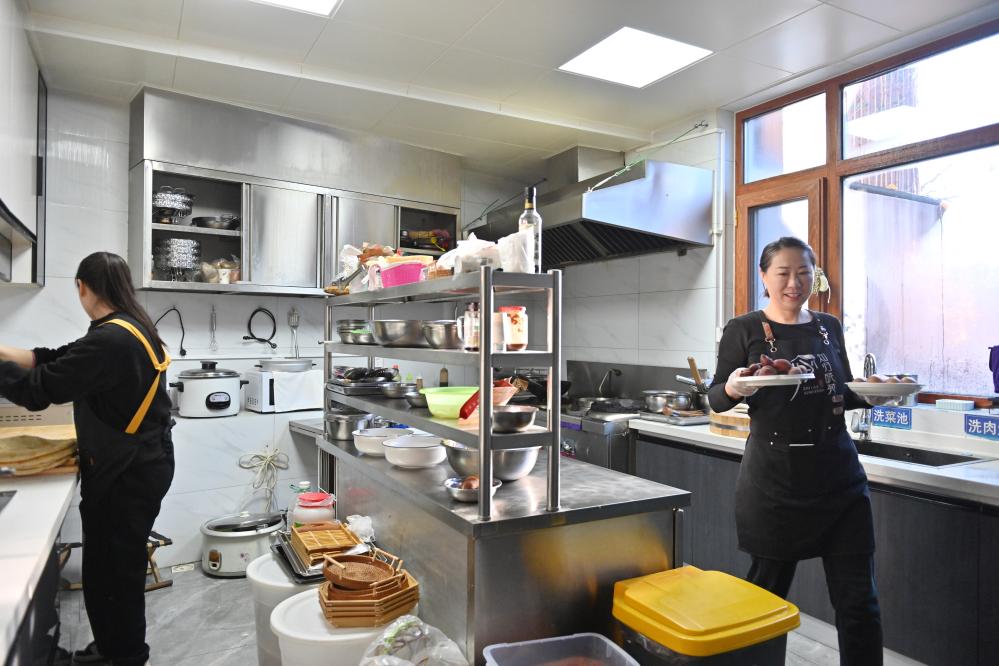 潘娜(右)在她的“知?dú)w曉苑”民宿廚房為客人端出早餐。新華社記者宋為偉 攝