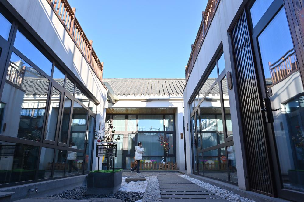 潘娜的民宿坐落在山腰上,是2年前由他們自家的房子改建而成。白墻灰瓦的外觀除了新一些,與村里其他房子并無差異。走進(jìn)傳統(tǒng)的木門,鋪著鵝卵石、擺放著磨盤的庭院精致而整潔,穿過2米多高的落地門窗走進(jìn)溫馨舒適的客房,智能家居系統(tǒng)自動(dòng)開始工作,播放輕音樂的同時(shí)拉開了窗簾,鋪著地暖的房間溫暖如春。如果不是窗外蓋著白雪的遠(yuǎn)山和田野,幾乎讓人忘記了身處在冬季北方大山深處的村落之中。