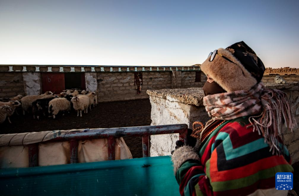 丹增在西藏那曲市尼瑪縣俄久鄉(xiāng)馬遷村老家趕羊入圈(2023年12月18日攝)。
