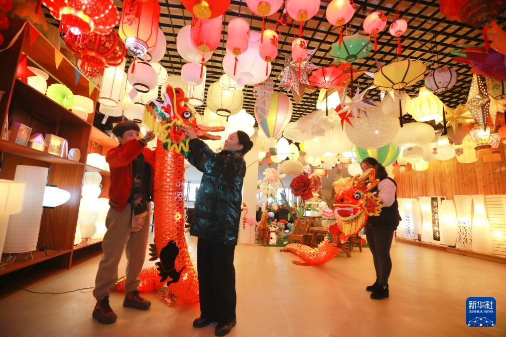 1月29日,福建南平武夷燈飾有限公司工作人員在展廳內(nèi)懸掛龍形燈籠。