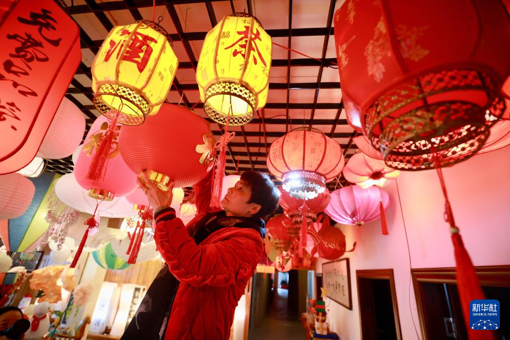 1月29日,福建南平武夷燈飾有限公司工作人員在展廳內(nèi)懸掛燈籠。