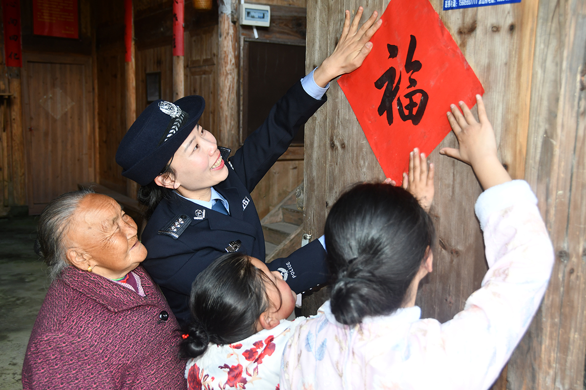 春節(jié)臨近,福建省壽寧縣公安局下黨派出所民警走進轄區(qū),為獨居老人送上生活物資,幫助他們與在外務工的親人接通視頻通話,并送上新春祝福。