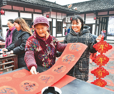 1月29日,四川省廣安市鄰水縣袁市鎮(zhèn)大光明社區(qū)的群眾在“翰墨迎春”文化下鄉(xiāng)活動(dòng)現(xiàn)場(chǎng)領(lǐng)取春聯(lián)。張啟富攝(新華社發(fā))