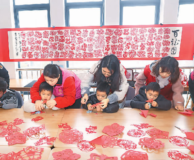 1月30日,浙江省湖州市長(zhǎng)興縣李家巷鎮(zhèn)中心幼兒園的老師和志愿者帶著孩子們剪龍年新春窗花。新華社記者 徐昱 攝
