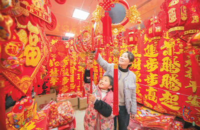 1月28日,江蘇省宿遷市宿豫區(qū)商貿(mào)城新年飾品賣場(chǎng)紅紅火火,年味十足;市民忙著挑選春節(jié)飾品,準(zhǔn)備過(guò)年。徐江海攝(人民圖片)