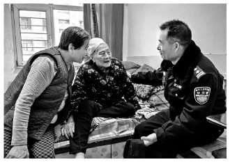 圖為民警王剛來到95歲的魏大娘家中進(jìn)行春節(jié)慰問,并提供便民服務(wù)。