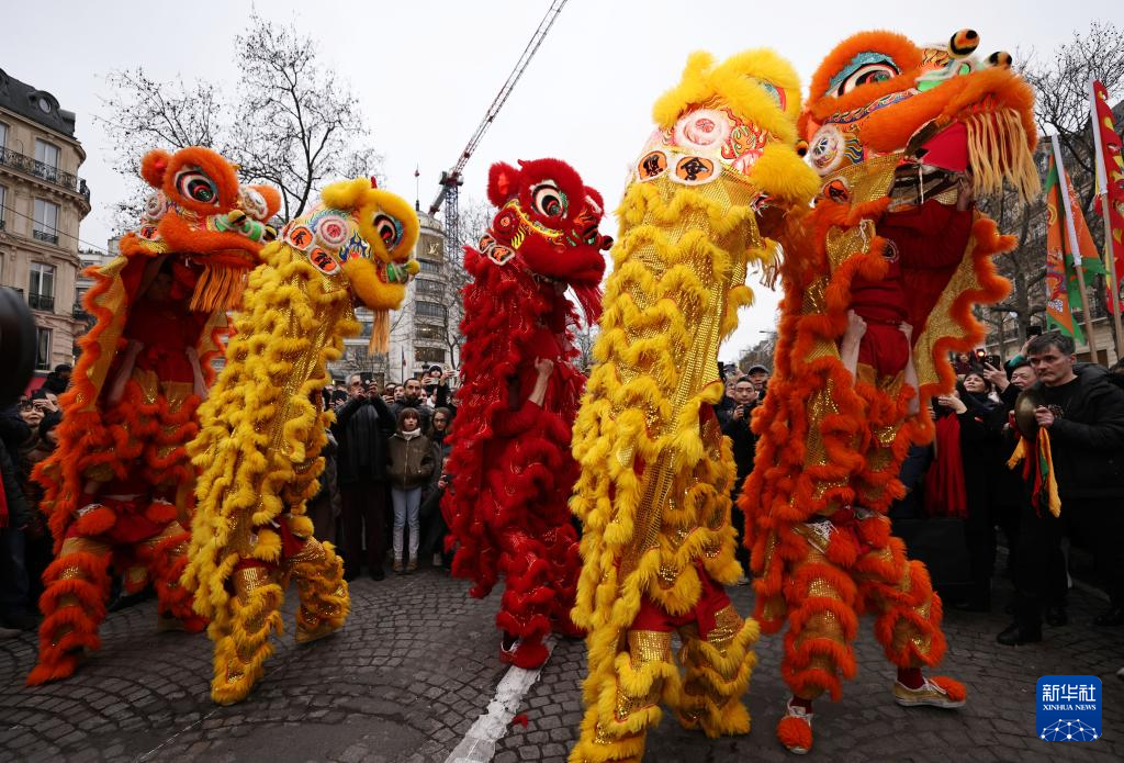 2月4日,人們在法國巴黎香榭麗舍大街觀看舞龍舞獅表演。