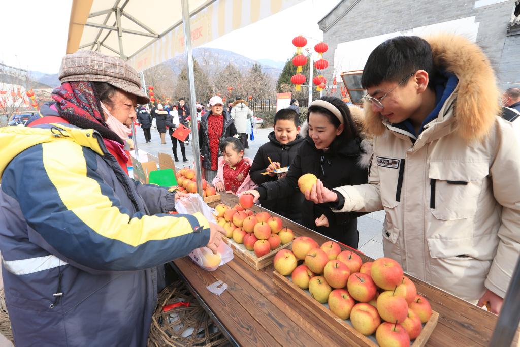 圖為游客在懷北古關(guān)迎春大集上購(gòu)買(mǎi)紅肖梨。(北京市懷柔區(qū)供圖)