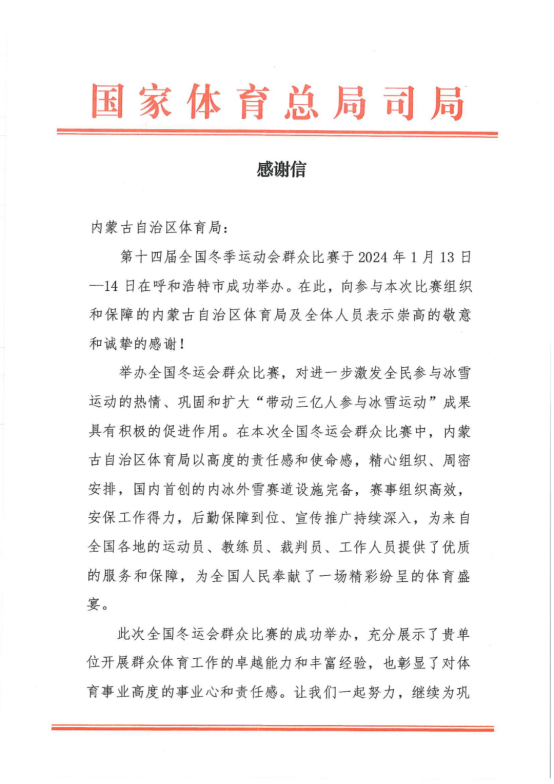 2月1日,國(guó)家體育總局群體司向內(nèi)蒙古自治區(qū)體育局發(fā)來感謝信,對(duì)內(nèi)蒙古自治區(qū)成功舉辦第十四屆全國(guó)冬季運(yùn)動(dòng)會(huì)群眾比賽表示充分肯定和高度贊揚(yáng)。信中指出,舉辦全國(guó)冬運(yùn)會(huì)群眾比賽,對(duì)進(jìn)一步激發(fā)全民參與冰雪運(yùn)動(dòng)的熱情、鞏固和擴(kuò)大“帶動(dòng)三億人參與冰雪運(yùn)動(dòng)”成果具有積極的促進(jìn)作用。本屆賽事賽道設(shè)施完備,賽事組織高效,后勤保障到位,宣傳推廣持續(xù)深入,為全國(guó)人民奉獻(xiàn)了一場(chǎng)精彩紛呈的體育盛宴。希望在共同努力下,為鞏固和擴(kuò)大“帶動(dòng)三億人參與冰雪運(yùn)動(dòng)”成果、推進(jìn)群眾冰雪運(yùn)動(dòng)發(fā)展做出更大的貢獻(xiàn)。