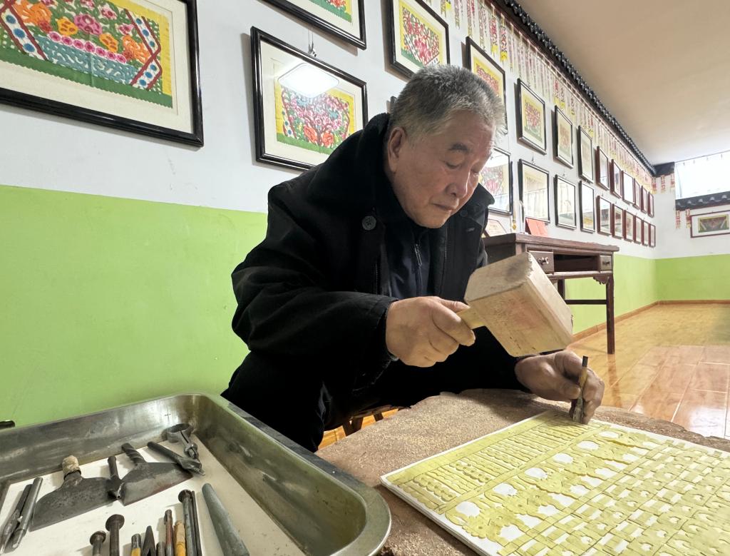 74歲的劉勝余拿著紙銼刀和小木槌,在一摞宣紙上依次鑿打出鏤空的花朵、銅錢和吉祥話語(yǔ)。兒子劉斌戴著指套,用細(xì)桿毛筆為形狀各異的宣紙逐層染上顏色……屋里滿是叮當(dāng)敲打和罐罐茶在爐火上滾沸的咕嚕聲。