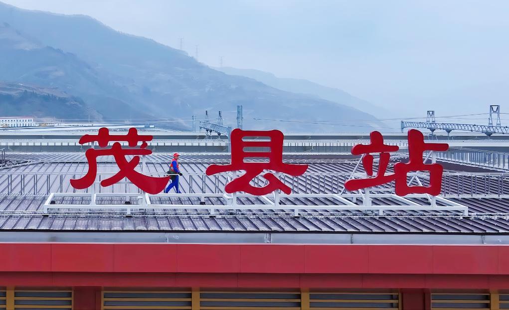 下午,溫暖的陽光灑在茂縣站房頂,唐永春通常會選擇在這個時候進行站房樓面檢查。樓頂凜冽的寒風迎面刮過臉龐,唐永春的身影從大紅色的“茂縣站”三個大字旁穿過,橙色的工裝背心成為站名牌邊的一抹亮色。