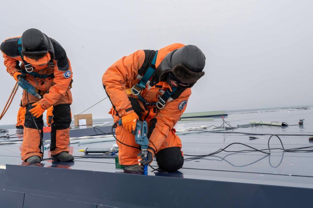 中國第40次南極考察隊(duì)員謝帥帥(右一)在工作中。新華社記者周圓 攝
