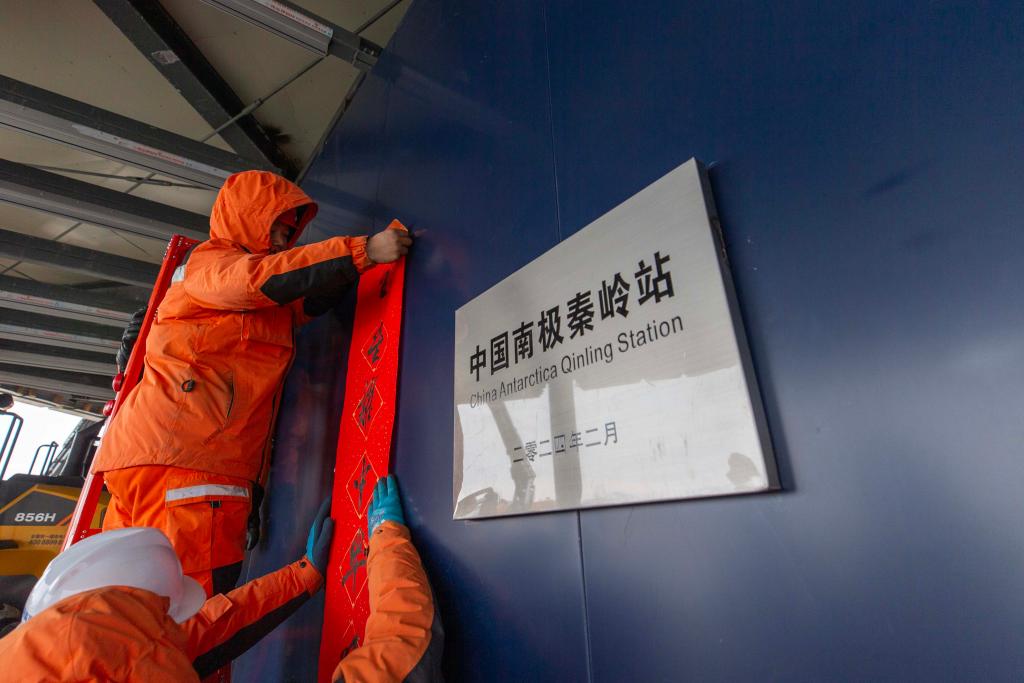 中國南極秦嶺站,中國第40次南極考察隊(duì)員正在貼對聯(lián)。新華社記者周圓 攝