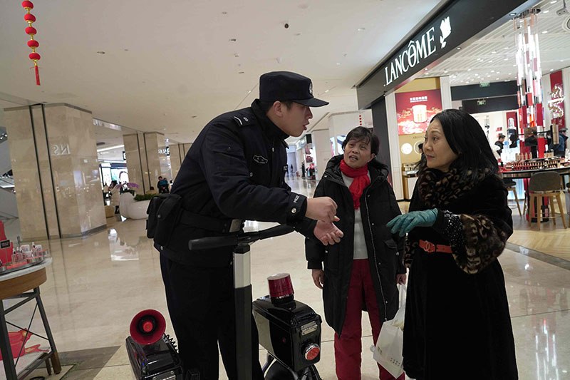 春節(jié)期間,湖北省武漢市公安局武昌區(qū)分局梅苑派出所民警肖楠和同事用心守護(hù)武商夢時代廣場的平安。