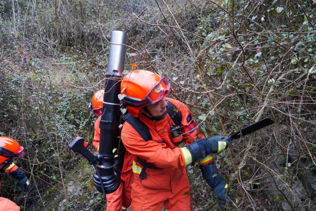 森林消防員利用砍刀開辟前進道路。(甘肅省森林消防總隊供圖)