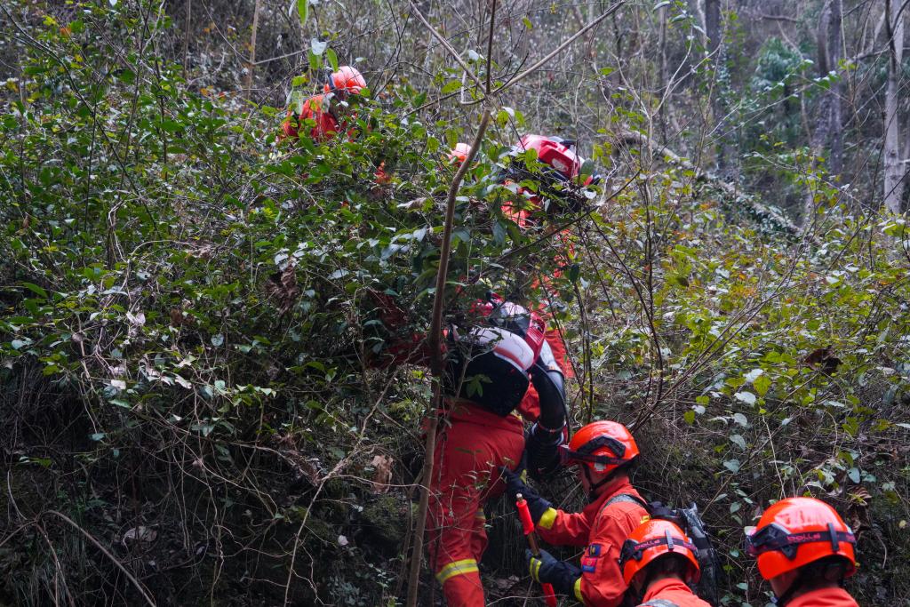 森林消防員們正在互相協(xié)助穿越灌木。(甘肅省森林消防總隊供圖)