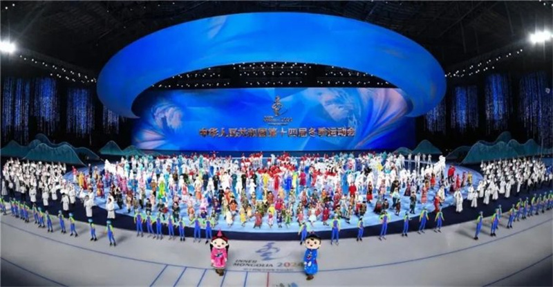 ▲2月17日晚,第十四屆全國冬季運(yùn)動(dòng)會(huì)開幕式在內(nèi)蒙古自治區(qū)冰上運(yùn)動(dòng)訓(xùn)練中心速滑館舉行。圖片來源:草原全媒