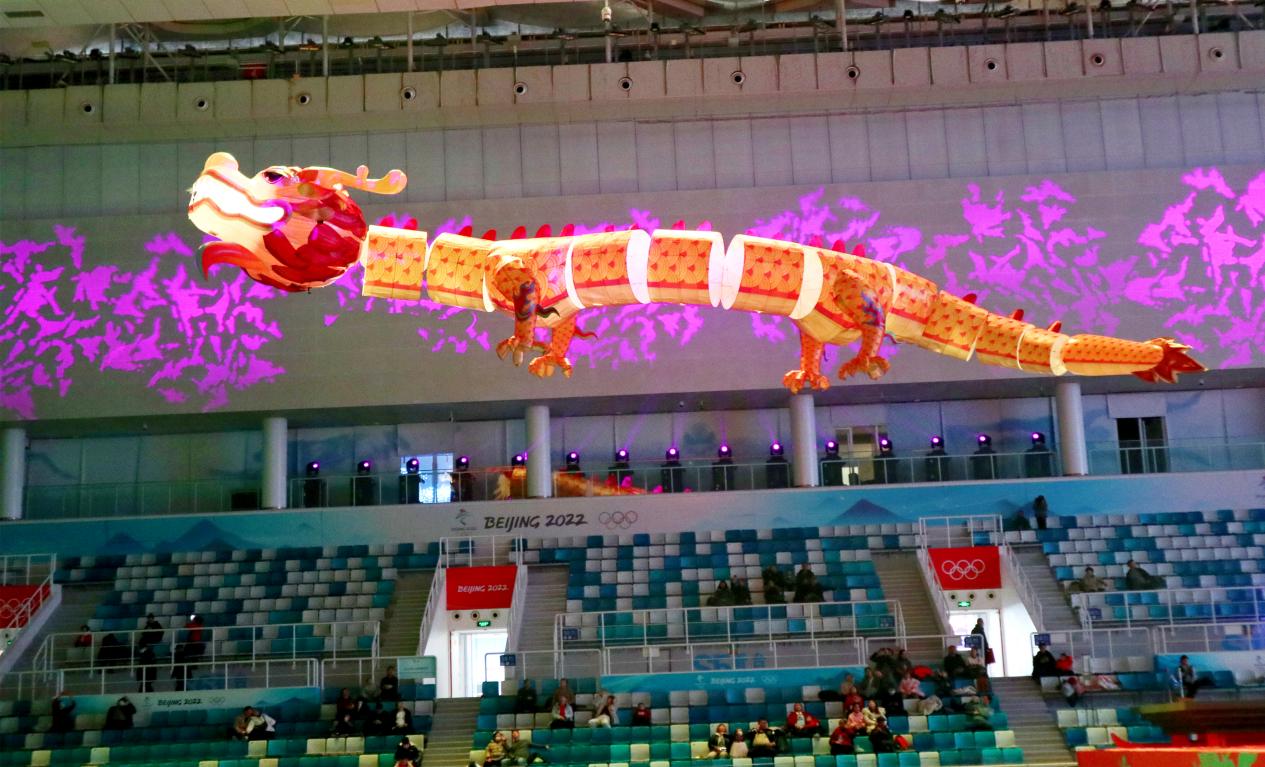 在水立方奧林匹克比賽大廳上空,30米長(zhǎng)的巨龍配合現(xiàn)場(chǎng)聲光電效果,從場(chǎng)館水面騰升而起,“若空游無(wú)所依”的巨龍景觀與奧林匹克中心區(qū)龍形水系遙相呼應(yīng),吉祥寓意氛圍感瞬間拉滿。