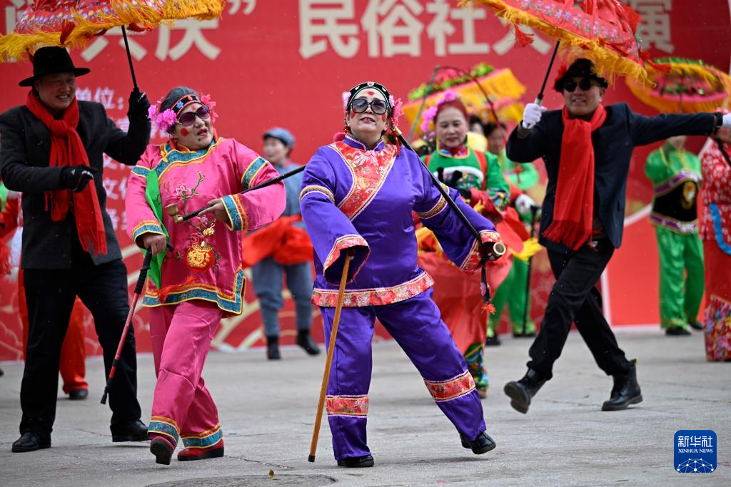 2月20日,在寧夏銀川市,參賽社火隊的演員表演傳統(tǒng)社火項目。