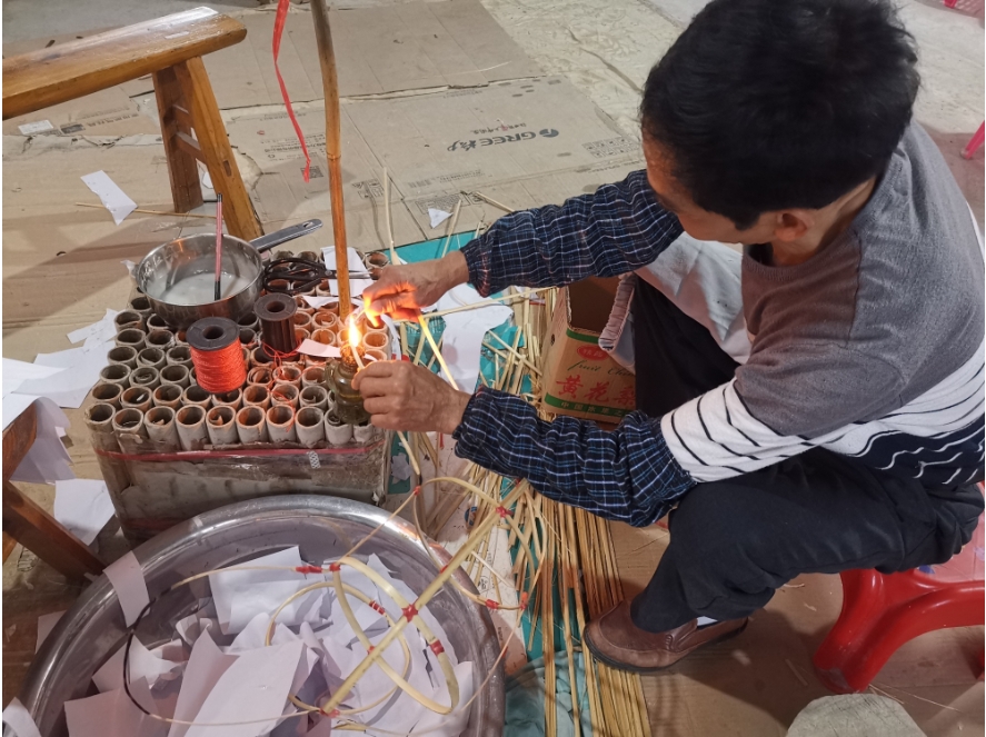 “客家方言中,‘燈’與‘丁’同音,雞公燈也寓意著財(cái)丁興旺?!敝苘矫饔么旨?xì)不一的竹子編出公雞外形,在竹架上糊上白紙,之后再上色,一個(gè)雞公燈便制作完成了。