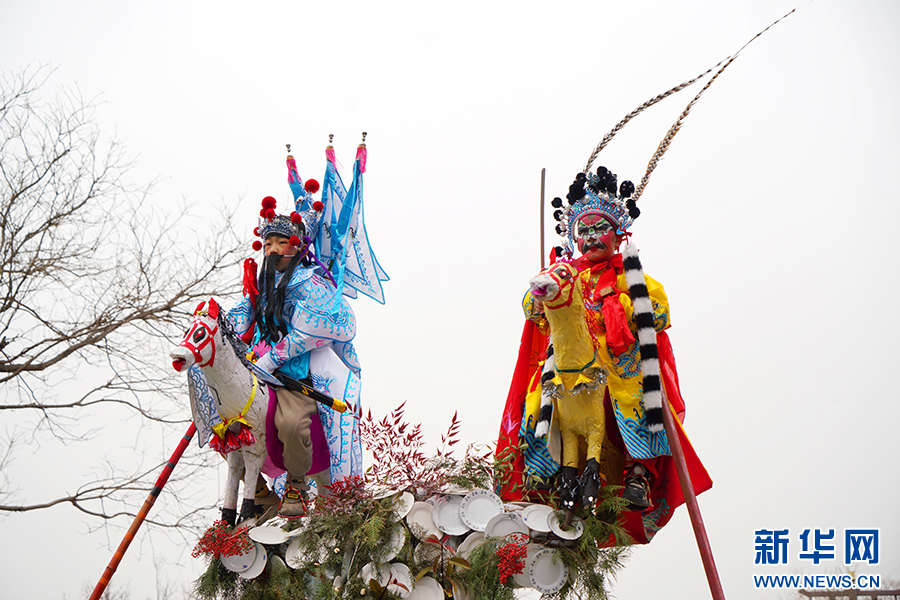 2月19日,在西安市臨潼區(qū)大唐華清城廣場(chǎng),陜西省非物質(zhì)文化遺產(chǎn)保護(hù)項(xiàng)目“馬踏青器山”社火表演。王三合攝