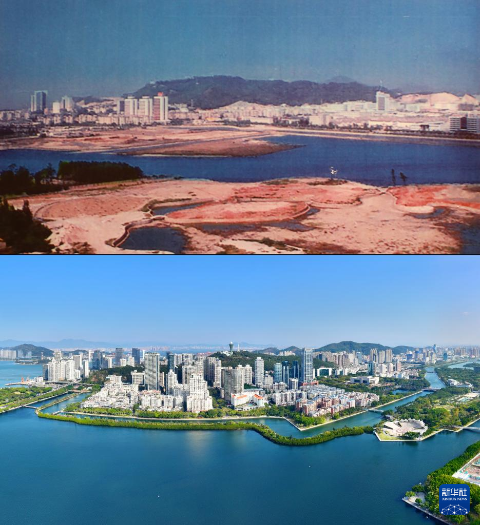 拼版照片:上圖為20世紀(jì)80年代拍攝的筼筜湖(資料照片);下圖為2024年1月24日拍攝的廈門筼筜湖及周邊城市景觀(新華社記者姜克紅攝,無人機照片)。