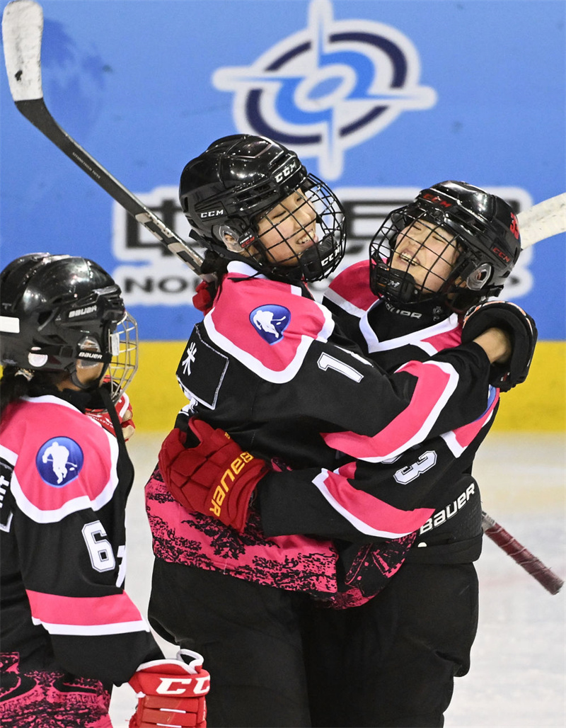 2月19日,北京隊(duì)球員吳思嘉(右)與隊(duì)友戴米慶祝進(jìn)球。新華社記者 鄧華 攝