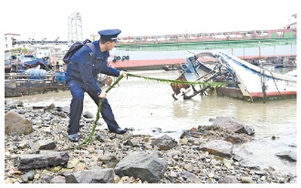 圖為巡邏時(shí),楊秀青在海岸線檢查固定漁船纜繩。