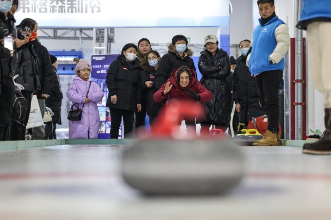2023年12月16日,市民在首屆呼倫貝爾·海拉爾冰雪產(chǎn)品冬季展銷會(huì)上體驗(yàn)冰壺。新華社記者 王楷焱 攝