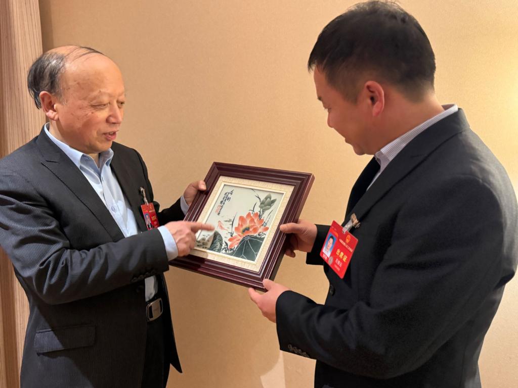 3月3日,全國(guó)人大代表、景德鎮(zhèn)陶瓷發(fā)展中心主任于集華(左)向參會(huì)代表講述景德鎮(zhèn)陶瓷文化。新華社記者 賴星 攝