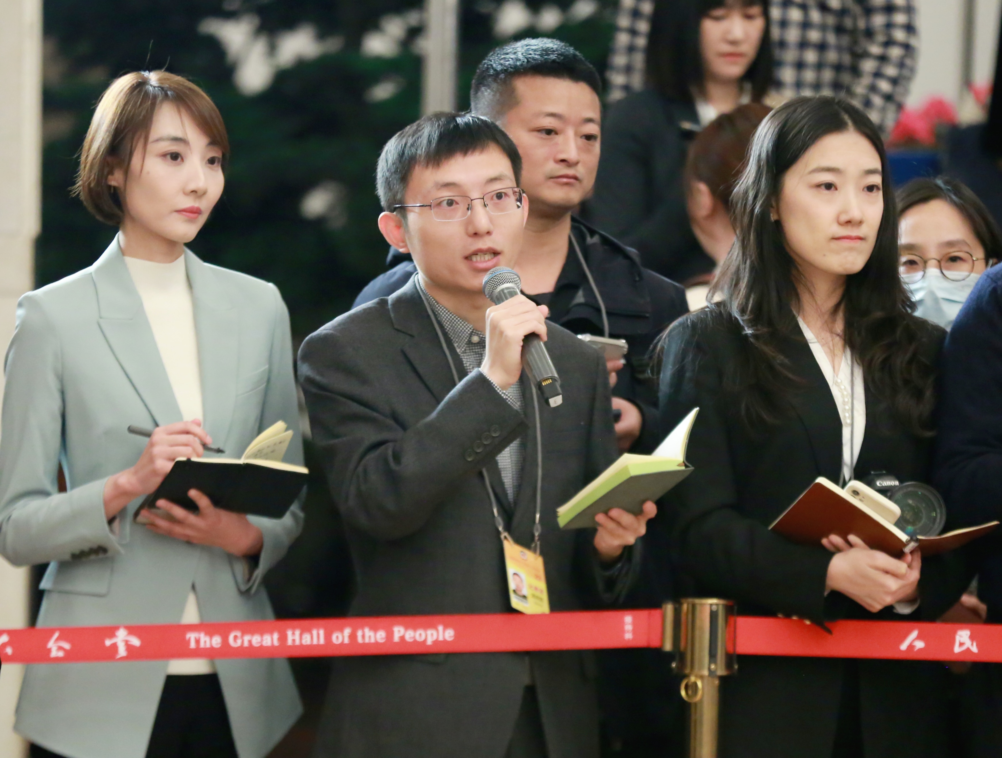 全國(guó)政協(xié)十四屆二次會(huì)議3月4日舉行首場(chǎng)“委員通道”采訪活動(dòng)。圖為本報(bào)記者提問。 本報(bào)記者 徐偉倫 攝
