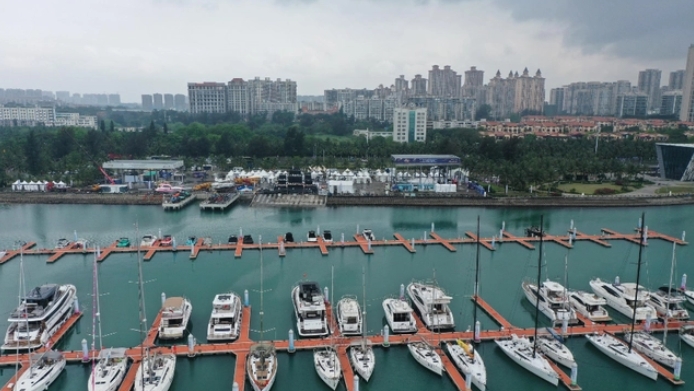 第四屆消博會(huì)游艇展的參展游艇陸續(xù)抵達(dá)??谑袊?guó)家帆船基地公共碼頭。記者 汪承賢 攝