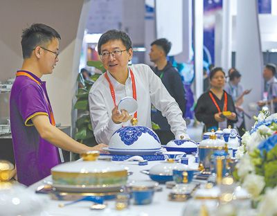 中國(guó)國(guó)際消費(fèi)品博覽會(huì)成為引領(lǐng)消費(fèi)時(shí)尚和促進(jìn)消費(fèi)轉(zhuǎn)型升級(jí)的重要平臺(tái),吸引了全球眾多優(yōu)質(zhì)品牌前來(lái)參展。圖為消博會(huì)全球特色消費(fèi)展區(qū)景德鎮(zhèn)展臺(tái)。