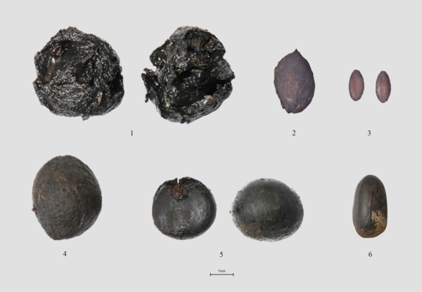 出土植物遺存(1.李; 2.李核; 3.甜瓜子; 4.梅核; 5.栗子; 6.蓮子)