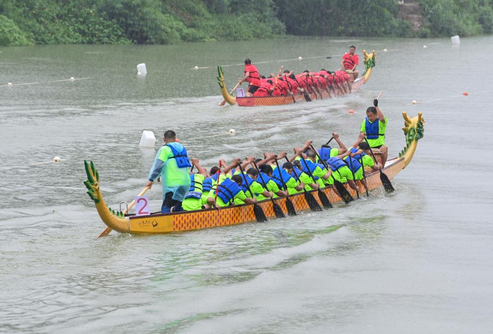 5月29日,在酉陽縣龍?zhí)舵?zhèn),龍舟隊在水面角逐。