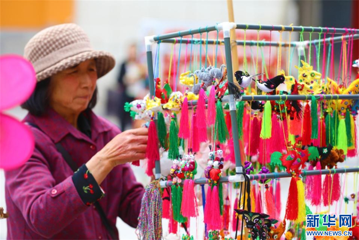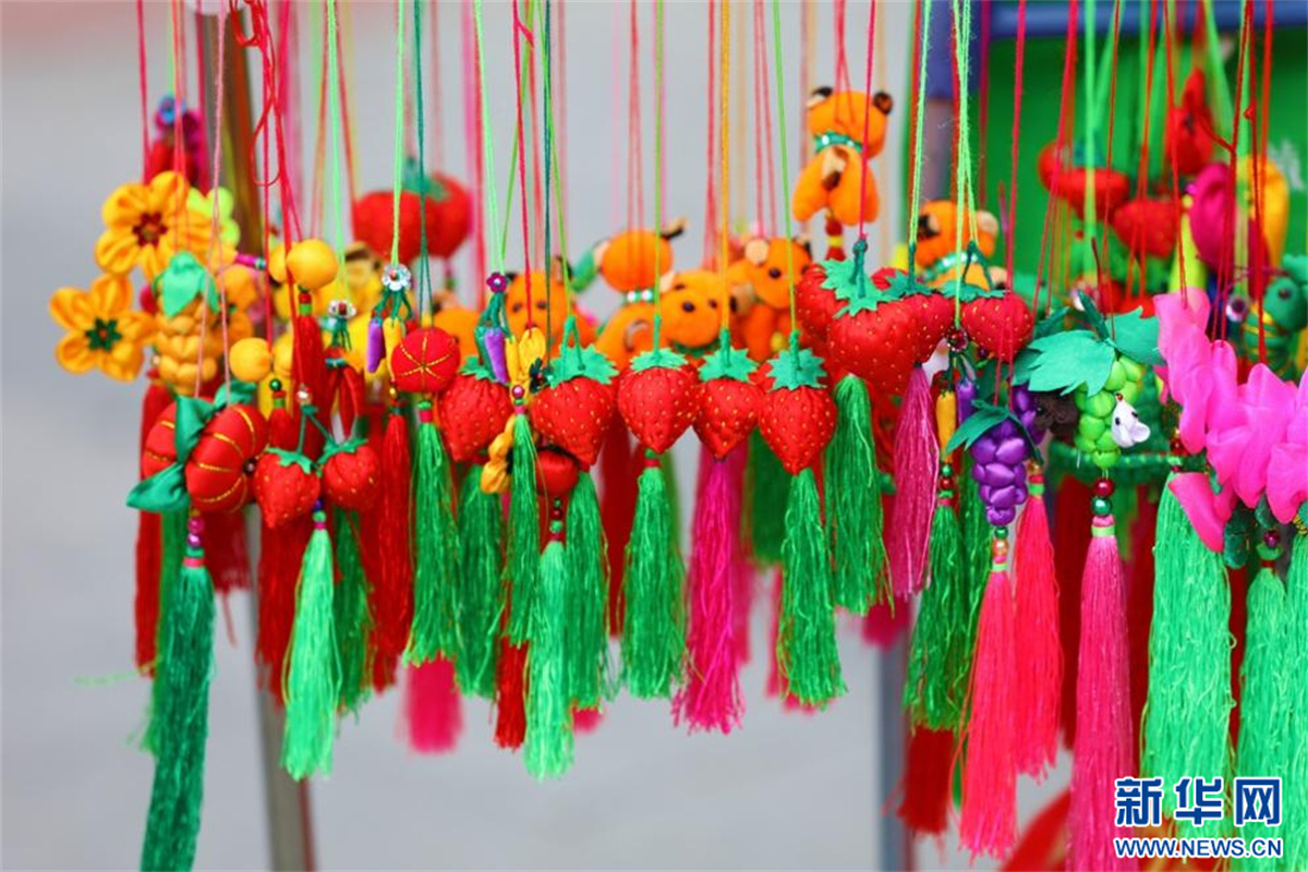 端午節(jié)臨近,甘肅省平?jīng)鍪兄行某菂^(qū)的攤位上掛滿了各式各樣的香包、手鏈等,色彩斑斕、醇香撲鼻,吸引不少市民前來選購(gòu)。新華網(wǎng)發(fā)(祁秋謹(jǐn) 王靖樂 攝)