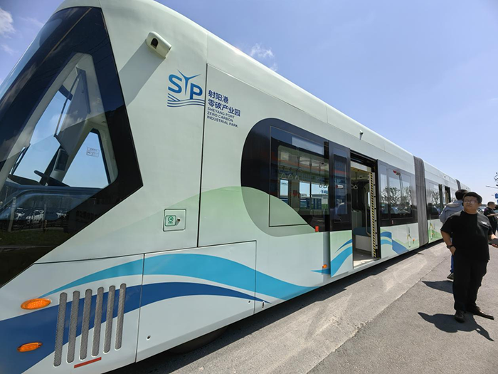 碧海藍天,迎風而行的是零碳巴士,車頂光伏、綠點充能、電池儲能等方式讓車輛平穩(wěn)行駛,而車載的各類傳感器識別路面虛擬軌道線路,精準控制列車行駛在既定“虛擬軌道”上,實行智能化運行。