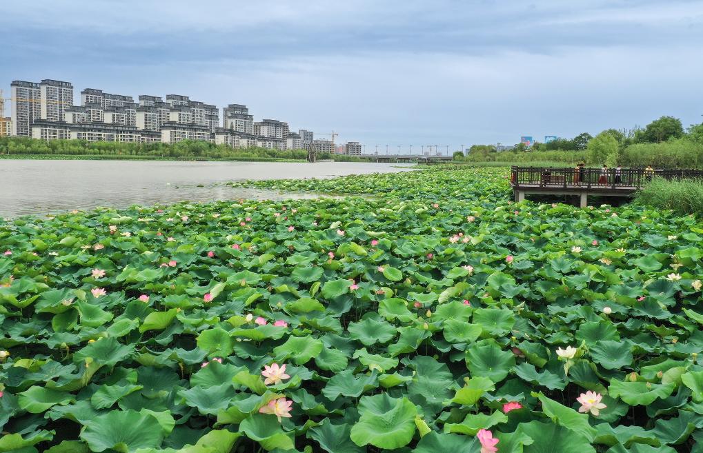 6月21日,陜西省富平縣石川河國家濕地公園內(nèi)荷花盛開。新華社記者 李賀 攝