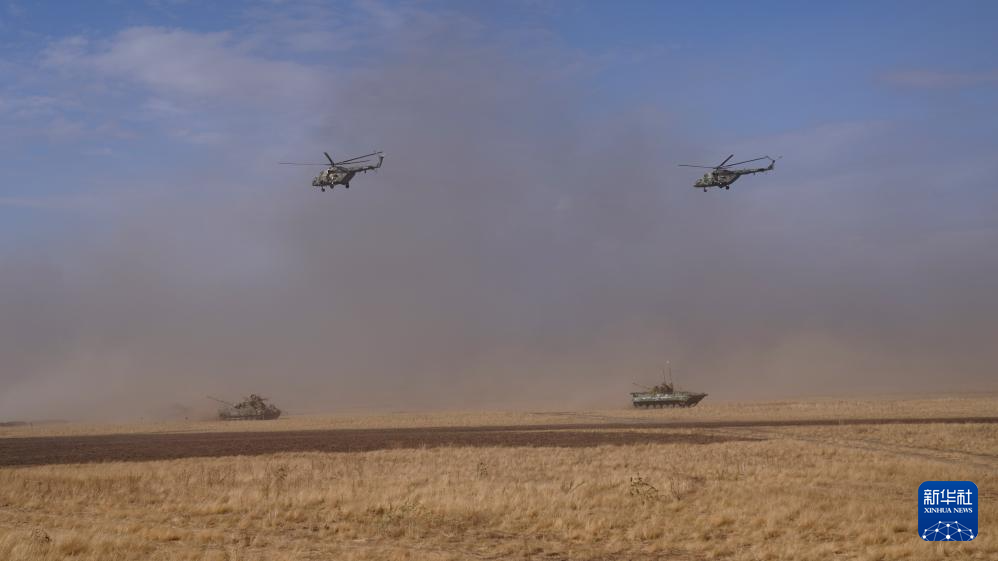 2021年9月23日,在俄羅斯奧倫堡州東古茲靶場(chǎng)舉行的“和平使命-2021”上海合作組織聯(lián)合反恐軍事演習(xí)實(shí)兵實(shí)彈演習(xí)中,多國聯(lián)合部隊(duì)進(jìn)行陸空協(xié)同作戰(zhàn)。新華社記者 梅世雄 攝