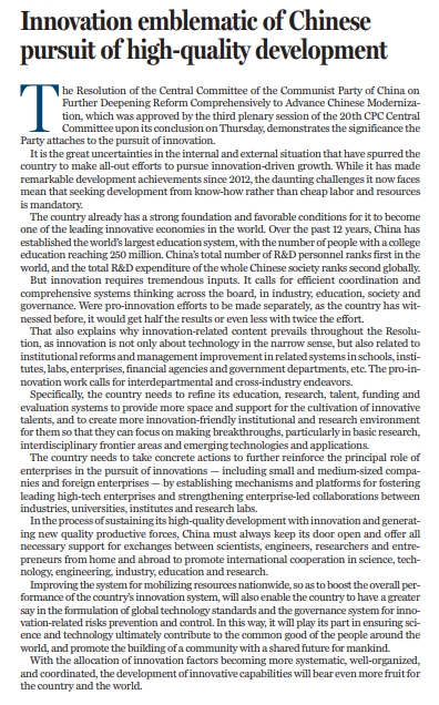 原標題:Innovation emblematic of Chinese pursuit of high-quality development