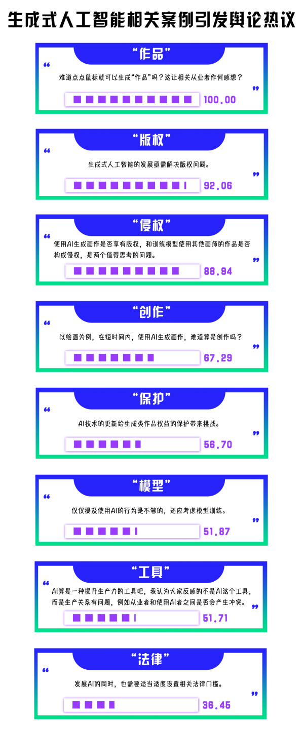 與生成式人工智能有關(guān)的案件一經(jīng)宣判,便引發(fā)了輿論廣泛關(guān)注,“作品”“版權(quán)”“模型”“工具”“法律”等詞語(yǔ)頻繁被提及,成為公眾討論的焦點(diǎn)。