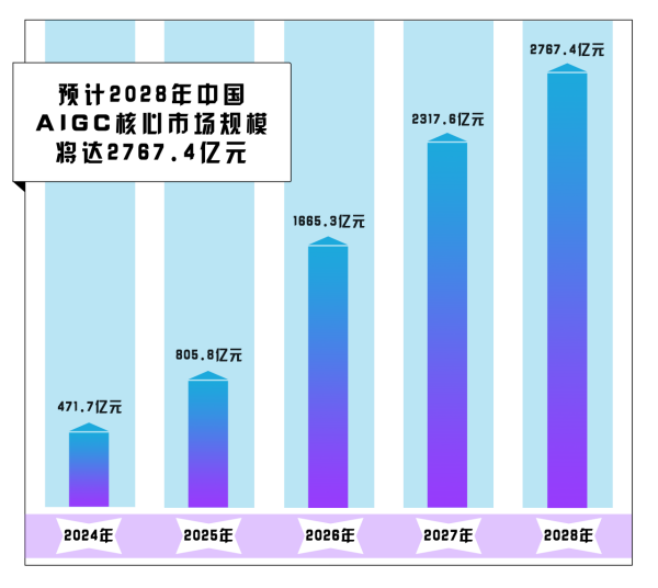 艾媒咨詢發(fā)布的《2023年中國(guó)AIGC行業(yè)發(fā)展研究報(bào)告》顯示,2024年我國(guó)生成式人工智能行業(yè)核心市場(chǎng)規(guī)模預(yù)計(jì)為471.7億元,2028年將達(dá)2767.4億元,規(guī)模相較2024年翻了近5倍。持續(xù)擴(kuò)大的市場(chǎng)規(guī)模,也面臨著風(fēng)險(xiǎn)和挑戰(zhàn)。