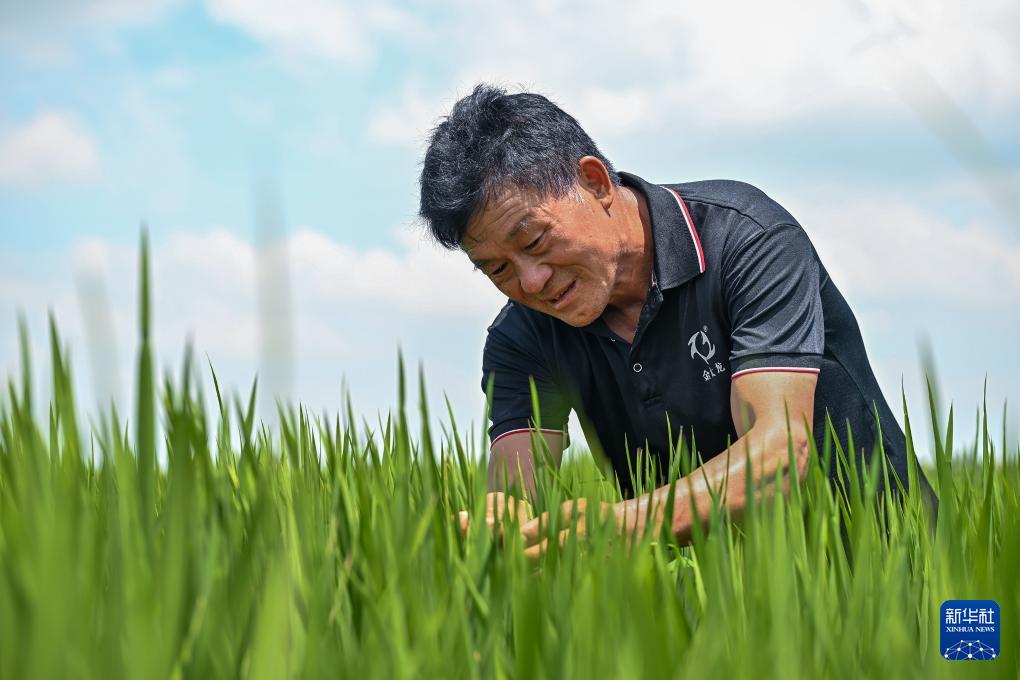7月25日,安徽鳳陽(yáng)小崗村種糧大戶程夕兵在田里觀察水稻長(zhǎng)勢(shì)。新華社記者 李鑫 攝