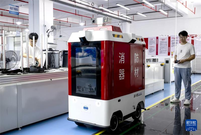 8月1日,技術人員在福建漢特云智能科技有限公司生產線上調試消防智能巡邏機器人。