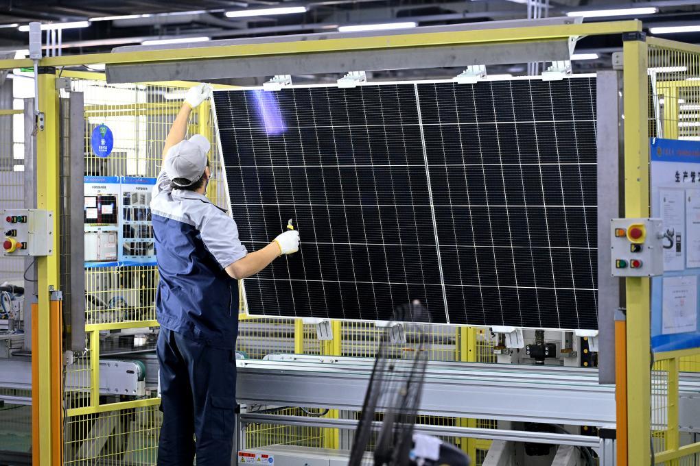 7月31日,山西省華陽新材料集團(tuán)華儲光電有限公司的工作人員在光伏生產(chǎn)線的層后外觀檢環(huán)節(jié)進(jìn)行組件檢驗,確認(rèn)無氣泡、并片、漏光等不良現(xiàn)象。新華社記者 李鑫 攝