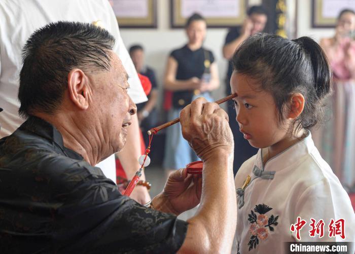 中新網(wǎng)福建沙縣8月5日電?。ㄔS琰)8月4日,在福建省三明市沙縣區(qū)鄧光布將軍祠,十幾名即將上一年級的孩子在長輩的注視下,行拜師禮、開筆破蒙、齊誦經(jīng)典,用沙縣獨有的蒙學式為即將到來的學習生活留下難忘紀念。