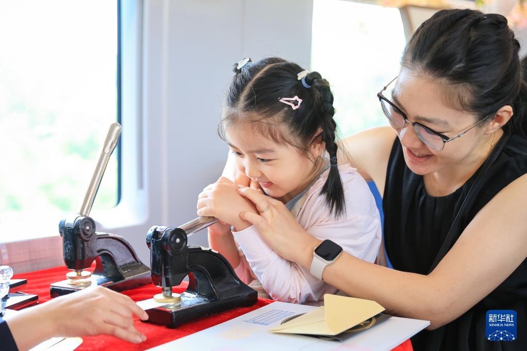 8月8日,在G132次列車上,家長和孩子一起體驗鋼印制作書簽。