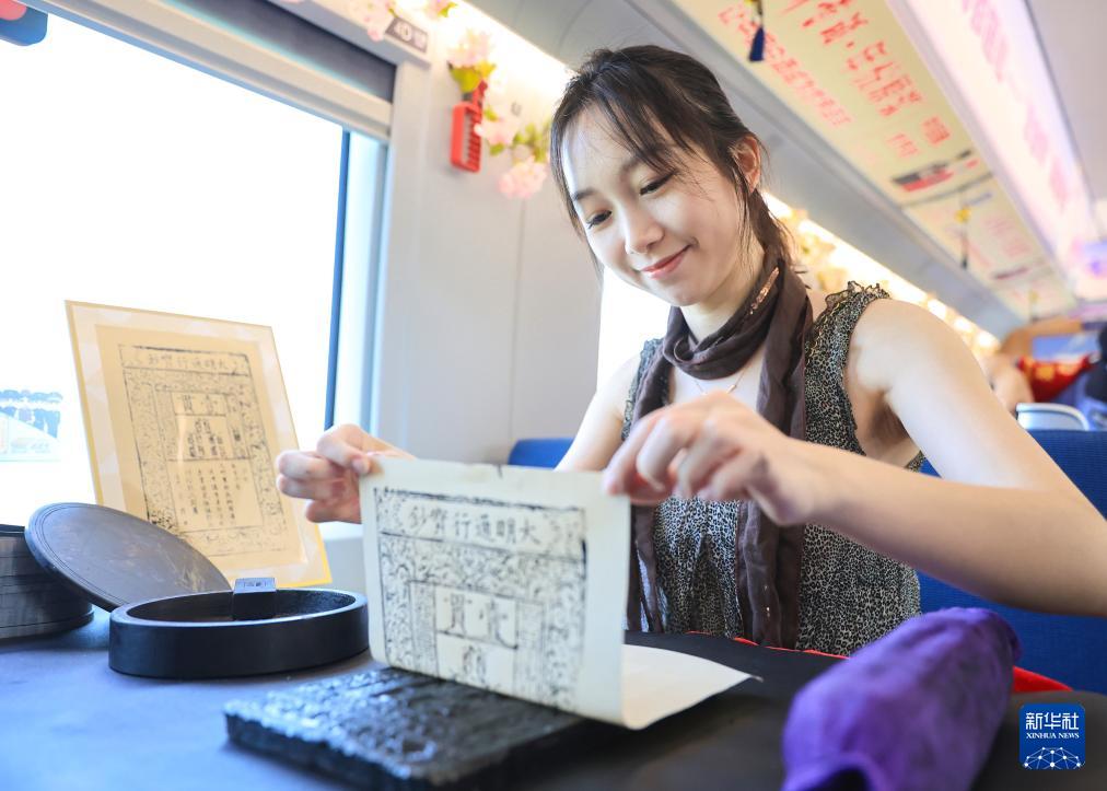 8月8日,在G7393次列車上,一名旅客在體驗(yàn)拓印。