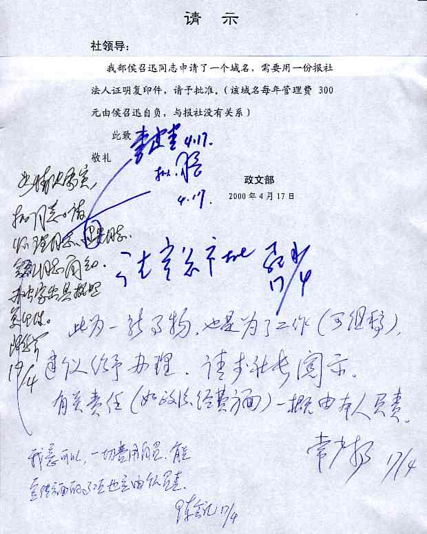 2000年4月17日,有關(guān)請(qǐng)示批件。